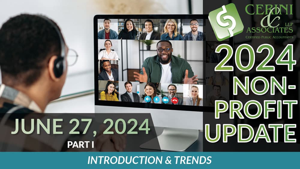 Cerini & Associates, LLP, a leader in providing accounting, auditing, and consulting services to nonprofits, held their virtual 2024 annual Nonprofit Update conference on July 27, 2024. The world continues to change and the nonprofit sector needs to be proactive in the process. This half day conference provided insight into on-going trends from industry leaders, experts, and professionals gather to explore the latest trends, updates, and strategies shaping the nonprofit sector. In a rapidly evolving landscape, this conference serves as a vital platform for nonprofit executives, board members, and C-suite professionals to stay ahead of the curve, exchange insights, and drive impactful change within their organizations.
